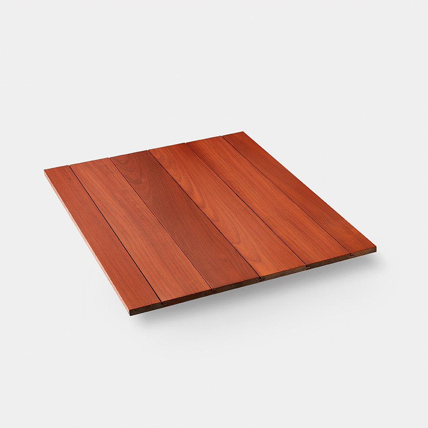 PADOUK is beschikbaar in verschillende profielen, en wordt onzichtbaar bevestigd op een houten onderstructuur.
